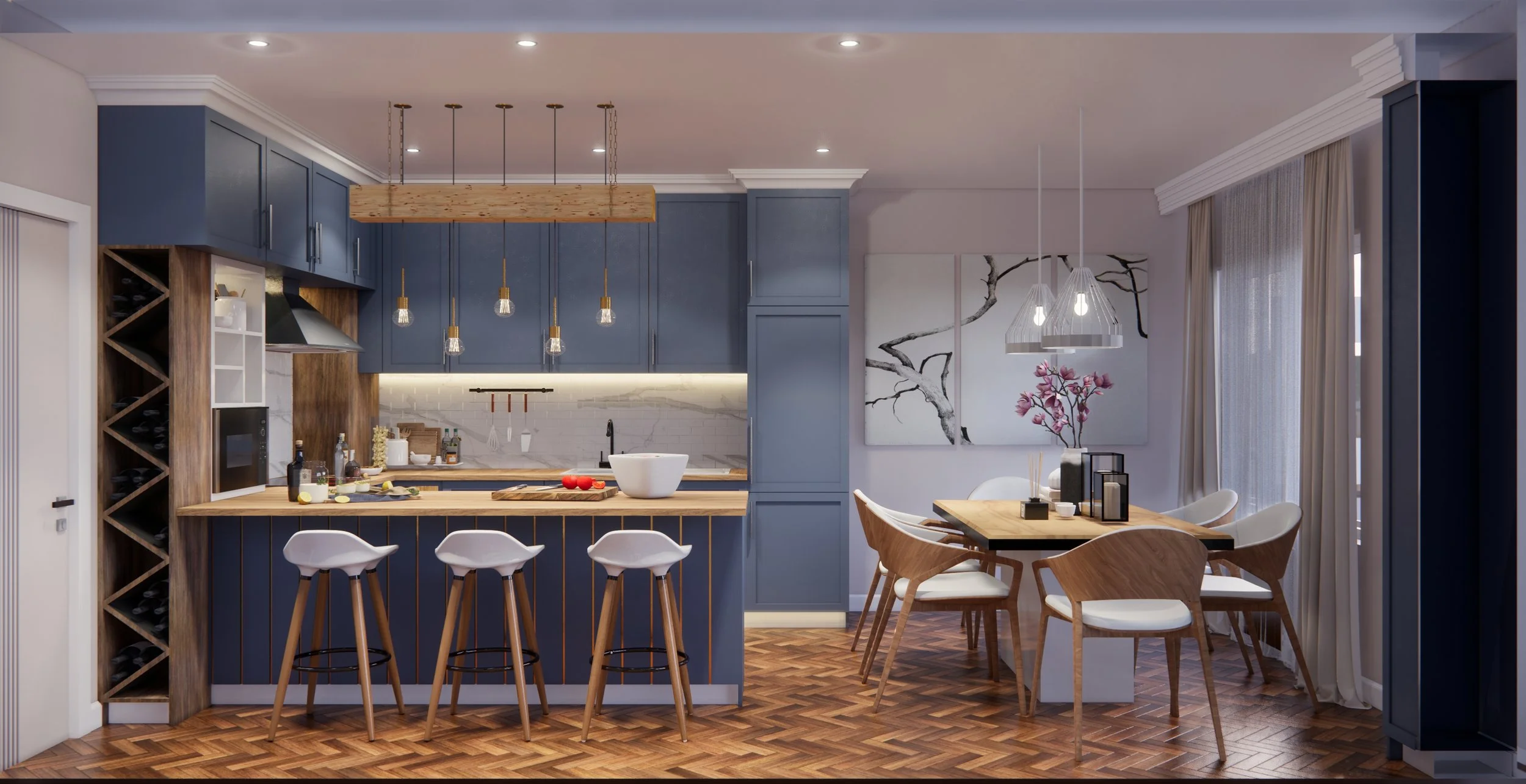 This apartment’s kitchen and dining area seamlessly combines bold design with inviting warmth, creating a space that is both striking and functional. Deep navy cabinetry contrasts beautifully with natural wood finishes and soft white accents, lending the kitchen a refined yet grounded feel. The central island, complete with modern bar stools and pendant lighting, is a perfect gathering spot for casual meals or lively conversation.