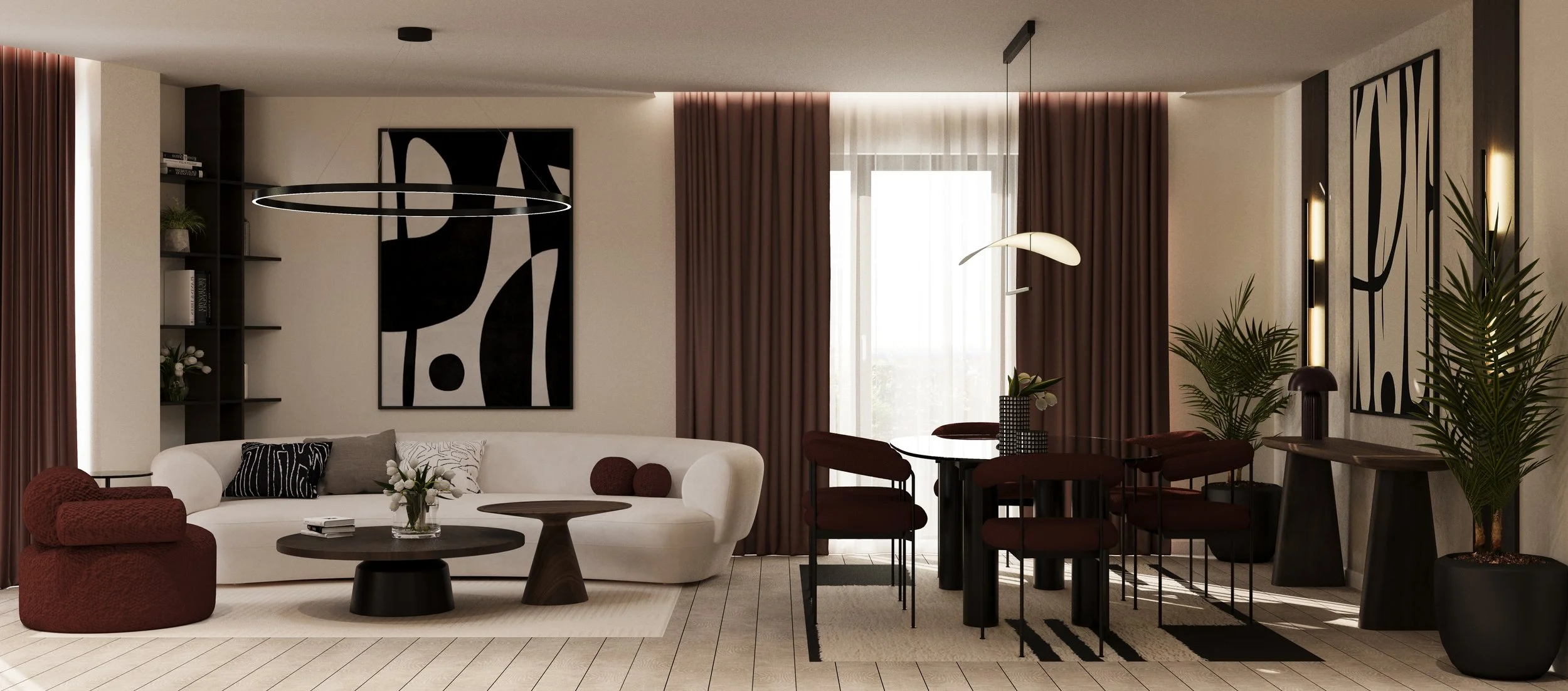 With earthy tones, deep burgundy accents, and refined details, the space radiates both character and calm.